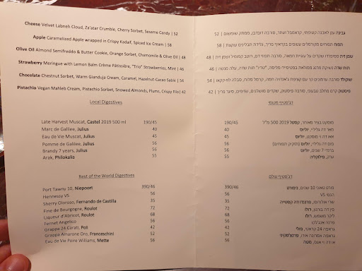 Read moreExcellent chef restaurant led by Gal Ben Moshe which is the owner of the PRISM restaurant that got a Michelin Star in Berlin! We came to a friday dinner . We recieved the square table in the middle of the restaurant. The food was delicious,we had some gluten free and Vegan options (not to many, the dishes just excluded te gluten where is possible). The restaurant located in the middle of Tel Aviv connected to the Tel Aviv Museum of Art. There is a big parking under the restaurant so it was very easy to find a parking. The dishes were very tasty, contemporary menu, fresh fish from the local fishermen. The price was a bit expensive, paid around 2200 ils for 6 people. The clientele were families, couples, business partners (I suppose...) as the restaurant is prestige and well designed and even won in 2014 the first place at the Space Design Award Idea-Top . The atmosphere was nice ,not to noisy ,the music was nice . The service was excellent, the waiter took an order from each one of us and took notes about the allergies of the members to try to change the dishes if possible. I think the only thing that annoyed me a bit is that the plates were a bit sticky when I touched some of them (sticky like... not so clean). In overall the restaurant is excellent and I will probably come back for another dinner. Very...
