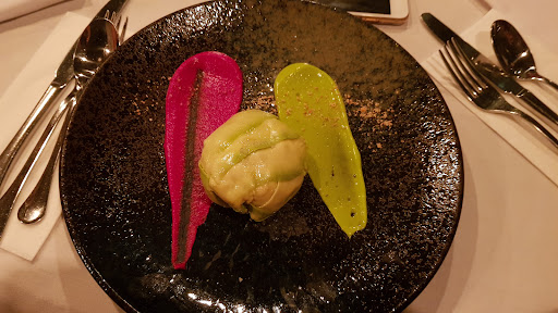 Sitting at the chefs' bar, eating dinner and watching the action, was the best meal we had in Tel Aviv. First, the food: He loved the whole meal, with these items of particular note: the turbot with 1/2 lobster, red tuna carpaccio with campari lemongrass sorbet and pickled seaweed, Tel Aviv mix of seafood and onions on tsatsiki, calamari with swiss chard stew, artichokes, fish ceviche wrapped in avocado with almonds and mint sauce.