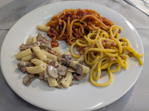Personalmente mi sembra strano che tutte le recensioni siano così alte. Il locale non è male, è accogliente e il personale ci ha accolto gentilmente, sono stati attenti a capire se qualcuno di noi avesse intolleranze o allergie ancora prima di portarci da mangiare, quindi questo sicuramente va a loro favore. Il tris di primi non era niente di speciale, la pasta con panna funghi e prosciutto era abbastanza saporita, ma niente di particolare. Nei bigoli alla carbonara sono abbastanza sicuro sia stata messa pancetta e poca, l'uovo era molto liquido (questo però dipende dai gusti personali) e la pasta aveva uno strano gusto, quasi di pesce o di vongole quando la si addentava. I bigoli alla amatriciana erano buoni, molto saporiti, piccanti il giusto (anche qui la piccantezza dipende dal palato personale). I secondi mi hanno deluso, la tagliata non era saporita, mancava di spezie ed era stata tagliata troppo finemente (quasi un roatbeef largo), il salame scottato sapeva di braciola, gli straccetti di pollo erano stranamente marsalati, il che non darebbe problemi normalmente ma sono stati affiancati a due tipi di carne tendenzialmente molto salati, la polenta non aveva sapore. I contorni erano normali. Ci sono stati portati degli assaggi di dolce che non erano male, ma avrei preferito prenderne uno dei tre. Per il comparto bevande il Cabernet che ho assaggiato non aveva molto sapore e non sapeva da cabernet, sì ci siamo fatti portare un vino scaraffato, quindi non mi aspettavo una qualità altissima, comunque non era un buon vino, nel liquore alla liquerizia sembrava non ci fosse nessuna traccia di alcool ma solo molto zucchero e liquerizia. Per quanto siamo stati trattati bene all'entrata durante il resto della serata nessuno è mai venuto a chiederci se volessimo un bis, altra acqua o qualcos'altro da bere, i camerieri passavano soltanto per prendere piatti e vassoi in modo da portarci la portata successiva. In conclusione, è probabile che io sia passato con il mio gruppo di amici e amiche in una serata no, in ogni caso non credo che ci tornerò, anche perché non c'è spazio per...