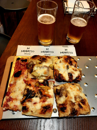 Bene eccomi qui! Finalmente ha riaperto il bar Mennitto! Sicuramente un'ottima accoglienza e tanta tanta gentilezza. Un buon caffè, ma la pizza è la vera protagonista. La pasta delicata, leggera e la croccantezza sono tutte caratteristiche che rendono la pizza unica per il genere proposto. Ottimo e puntuale anche il servizio prenotazione. Se poi c'è Francesco, non indaffarato nel retrobottega, puoi anche parlare di musica e soprattutto di calcio, essendone lui un ottimo...