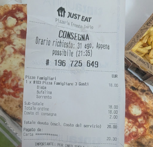 Ordino con Justeat spesso da questo locale ed ogni volta attendo 1 ora, anche se ordino con dicitura "appena possibile" alle 19 e 30. Il ritardo è perdonabile ma questa sera è andato tutto male. Ordino alle 19 e 30 richiedendo la consegna appena possibile. Una pizza a metro con i gusti: bimba, Sorrento e bufalina. La consegna è prevista per le 20 e 30. Alle ore 21 e 25 richiedo informazioni utilizzando il tasto di Justeat e mi viene chiesto di aspettare 10 minuti che l'ordine era in consegna. Alle ore 22 decido di chiamare il locale e chi mi risponde pare sorpreso dalla richiesta dell'ordine. "Non c'è nessuno ordine, ma hai chiamato la pizzeria giusta?", mi viene chiesto e successivamente mi passano un'altra persona. Dopo qualche minuto l'ordine viene trovato ma non si apre e quindi ripeto che cosa avessi ordinato. Mi viene chiesto di aspettare il rider per la prossima consegna, acconsento e chiedo per favore di farlo arrivare prima possibile. Alle 22 e 20 arriva finalmente la pizza, insieme ad un contenitore per le fritturine. Il rider mi dice che sono terminati i wurstel e la pizza "bimba" non si poteva fare. Prendo tutto, sconsolato visto che mancava il gusto che era stato scelto per primo, inizio a mangiare e viene notato su una fetta di pizza un fungo, di cui allego foto. Lo scontrino, sempre in foto, riporta l'orario del messaggio inviato da Justeat, con la presunta consegna.