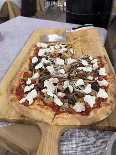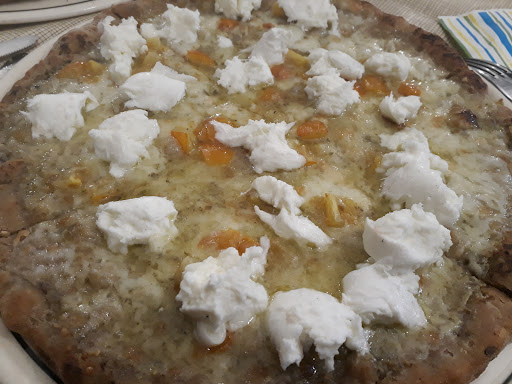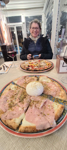 Around the corner from our hotel, it was a great find. Pizza was made fresh and served hot. The thin crust was perfectly cooked and the flavors of the toppings blended together perfectly. I had one with Mortadella and Barrata, they gave me an entire Barrata! The veggies pizza was fantastic, very fresh ingredients. The individual pizza are big enough for two but you won't want to share them. 2 pizzas,a bottle of water and 2 glasses of wine cane out to 28 Euros....