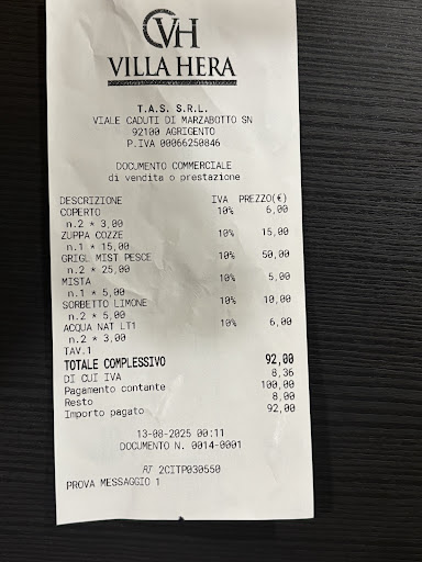 Read moreHo dato 1 stella perché non potevo dare 0. Siamo stati “ingannati” da Francesca, una dipendente del ristorante, che ci ha avvicinati all’uscita dalla visita alla Valle dei Templi, offrendoci una brochure con due menù: 18 € per quello di carne e 23 € per quello di pesce, assicurandoci che il ristorante fosse vicino. Erano passate le 21, eravamo stanchi e affamati, quindi abbiamo deciso di fidarci. Mai scelta fu più sbagliata. Arrivati al ristorante, la realtà era ben diversa da quanto promesso: Il personale (tranne un cameriere che sembrava più professionale rispetto agli altri, evidentemente improvvisati…) era sgarbato, maleducato e superficiale. Nonostante tutto, abbiamo ordinato e scoperto che i prezzi dei menù erano diversi da quelli indicati nella brochure.m (aumentati di 2€ a menù). Quando l'ho fatto notare, avendo ancora la brochure in mano, il cameriere, con arroganza, ha detto che i prezzi erano cambiati e che quella era una brochure vecchia. Ma se Francesca aveva scritto il suo nome a penna sulla brochure, perché non aveva anche aggiornato i prezzi? Era solo un modo per “ingannare” i clienti? La situazione è peggiorata quando, oltre ai menù, abbiamo ordinato due pizze. Quando ho chiesto una marinara, il cameriere mi ha chiesto se la volessi solo con sugo e acciughe. Ho quindi risposto che la marinara non ha acciughe e che quindi la gradivo con solo sugo e lui, con arroganza, ha replicato “ad Agrigento la marinara si fa con le acciughe”, quando abbiamo ordinato una pizza con patatine, ha risposto in sempre in modo arrogante “che quella pizza allora si chiama tedesca” e non margherita con aggiunta di patatine, infine abbiamo chiesto un piatto senza formaggio in quanto una di noi è allergica al latte e il cameriere ha risposto “sì, non lo mettiamo perché nemmeno a me piace il formaggio”. I piatti sono arrivati e la pizza marinara era immangiabile, un brodo di sugo insapore (allego foto!). L’ho lasciata tutta e nessuno dei numerosi dipendenti del ristorante ha chiesto perché fosse rimasta intera (mancava solo una fetta). I menù di pesce non erano male male, ma l'atmosfera ormai era rovinata. Purtroppo, se si vuole passare una serata in allegria, questo non è il posto adatto!!! Esperienza da...