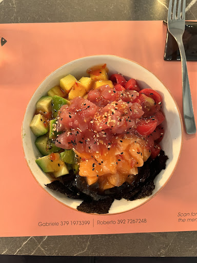 Very nice sushi / poke bar with heated patio, 100 m from the beginning of the main street / ZTL, so a more relaxed atmosphere and probably not as busy as others as it's a bit hidden away, but you're reading this so you'll find hidden gems like this! My waiter was the now Internet famous gentleman with glasses (sorry I forgot to ask your name) who speaks English very well. He was lovely, made me comfortable and I appreciate that as a solo dinner. Menu also in English, including the poke ordering sheet that you fill out. I wanted to take a break from Italian cuisine and am glad I did because Yoshi sushi bar was exactly what i was craving. In my opinion the portion was perfect for a whole meal. Pistachio segafredo was pretty good. I came early for dinner (according to Italian customs anyway) around 7 pm, and it was no problem. Poke with 2 proteins, dessert, water, and service charge came...