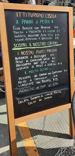 Abbiamo pranzato in questo "locale" lo scorso fine settimana (l'ultimo di settembre), insieme agli amici dell'ASD di cui facciamo parte, dopo un'immersione all'Isola Gallinara. Per noi è stata la prima volta in un "ittiturismo" e l'esperienza è stata assolutamente positiva; se amate i più noti e diffusi "agriturismi", quelli veri, questo può essere il posto giusto. Il personale, gentile e disponibile, ci ha piacevolmente accolto anche a tarda ora, lasciandoci mangiare in tutta tranquillità fino a pomeriggio inoltrato. Abbiamo avuto l'opportunità di scegliere tra un tavolo su terra ferma (la banchina del porto) od un tavolo su una delle due barche ormeggiate proprio lì difronte; noi, nel dubbio, abbiamo scelto il tavolo su terra ferma. Purtroppo, vista l'ora, la fame non era più molta ed in tre siamo riusciti a degustare poche cose: arancino dell'Isola (fritto più a lungo del tradizionale arancino Siciliano, molto croccante all'esterno, ma meravigliosamente morbido dentro), bruschetta dell'Isola (con formaggio spalmabile, dadolata di pomodoro e pesce cavalla che abbiamo imparato essere un parente stretto del più noto sgombro), linguine con pescato e fritto di tremaglio (per chi non lo sapesse, il tremaglio è un tipo di rete da pesca, e questa locuzione è un modo come un altro per indicare sostanzialmente il pescato locale; naturalmente assenti anelli surgelati di dubbia provenienza) e per finire la stroscia ligure (un dolce tipico ligure che per certi versi ricorda la sbrisolona, realizzato, di base, con farina, zucchero, scorza di limone ed olio extravergine di oliva del quale ne viene esaltato il sapore). Soddisfatti di quello che abbiamo mangiato, ma dispiaciuti di non essere riusciti a degustare di più, ci siamo portati a casa alcuni prodotti preparati da loro: un vasetto di pesce cavalla sott'olio ed un vasetto di pesce cavalla salato ed essiccato per condire la pasta. Prezzi adeguati, ma onesti: circa € 40,00 in tre...