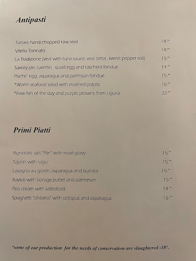 An amuse bouche appeared. It was perfunctory; nothing unusual or exciting. After another length of time, my antipasto arrived: roasted scallops. They had been seared and roasted (or possibly vice versa)--but in any case over cooked and starting to get tough. Another very long interval occurred before my primi arrived: tajarin with butter sauce and Alba white truffle. The manager shaved a nice quantity of Alba white truffle onto the pasta. The pasta, however, was heavily sauced with butter not all of which was even melted--there were chunks of butter amidst the tajarin. There was nothing subtle about the dish; and with a dish of this simplicity, subtlety is the essence. I did get a dessert, but it, too, was nothing to write about.