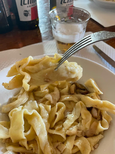 Dopo una passeggiata per funghi abbiamo deciso di fermarci a mangiare qualcosa prima del rientro a casa. Dopo aver chiamato per chiedere se fosse possibile pranzare, alle 12.30 ci è stato risposto di sì e che saremmo potuti arrivare per le 13. Arrivati intorno a quell’ora ci preparano un tavolo all’esterno. Una cameriera ci elenca il menù del giorno, senza illustrarci i prezzi di quello che andiamo ad ordinare. Il menù di quel giorno è composto da alcune varietà di antipasti a base di funghi, 3 primi e 2 secondi, tra cui una tagliata, che ci viene sconsigliata dalla stessa cameriera per l’attesa a cui saremmo andati incontro.. Decidiamo allora di ordinare un antipasto da dividere, 5 primi (2 tagliatelle e 3 gnocchi) e 4 secondi (4 polenta e cinghiale), pietanze che permettessero anche allo staff di agevolarli nel servizio e nelle tempistiche. Dopo 30 min ci arriva l’unico antipasto ordinato (2 crostini di pane con funghi trifolati), passati altri 30 min (h.14) arrivano 2 delle 5 prime portate, alché , visti i ritmi lenti del servizio, chiediamo alla cameriera quanto avremmo dovuto aspettare per gli altri primi piatti, di modo da regolarci, visto che con noi c’era anche un bambino piccolo… Ci viene risposto in maniera scocciata che in 5 min sarebbero usciti i restanti 3 primi… Passano 15 min e ci arrivano gli gnocchi (h.14.15). Chiediamo in quel momento di annullare le seconde portate, vista l’ora che si era fatta e le ore di viaggio che avremmo dovuto affrontare con il ritorno a casa. Scocciata, la cameriera ci dice che i secondi piatti erano già in preparazione e che oramai non ci poteva fare nulla. La discussione si accende (perché va bene tutto, ma è impensabile aspettare 1.20 solo per metà delle portate che avremmo dovuto consumare) e la cameriera la risolve dicendo che sarebbe uscita la titolare per chiarire la situazione. Esce la titolare dopo 5 min e ci dice che i secondi oramai erano quasi pronti e che se non avessimo voluto mangiarli sul posto, ce li avrebbe impacchettati e fatti portare via…. H 14.30 siamo andati via dopo aver pagato tutto e consumato solo metà del pasto ordinato e con l’altra metà arrogantemente sbattuta sul tavolo per mandarci a casa. So che sembra un racconto comico, ma è tutto vero…. Se non riuscite per qualsiasi motivazione a svolgere un adeguato servizio, anche con i pochi tavoli che avevate durante il pranzo oltre al nostro, siate sinceri e onesti nel comunicare fin da subito le vostre difficoltà nel riservarci un posto o la vostra filosofia di servizio, come la preparazione al momento della pasta fresca…., perché così facendo avete fatto una pessima figura e nel non dimostrarvi trasparenti e arroganti avete permesso che altri 5 dei tanti clienti passati da voi ne uscissero completamente delusi e certi che da voi non ci sarebbero...