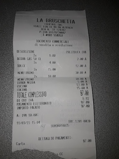 Read moreFacendo un giro per Albenga ci siamo fermati in questo posto...anzi diciamo la verità, stavo leggendo le proposte del giorno e il titolare è uscito fuori dicendoci che se fossimo andati via ce ne saremo pentiti e che nel caso ci fossimo fermati e qualcosa non ci fosse piaciuto non lo avrei pagato. ..vi dico subito che abbiamo pagato tutto....era tutto BUONISSIMO!!!!! era tutto RRESCO!!!!!! siamo rimasti molto ma molto soddisfatti. I piatti per fortuna abbondanti..se dovessimo ritornare ad Albenga sappiamo già dove andare a mangiare. Parola di camperisti da Torino. Pranzo...