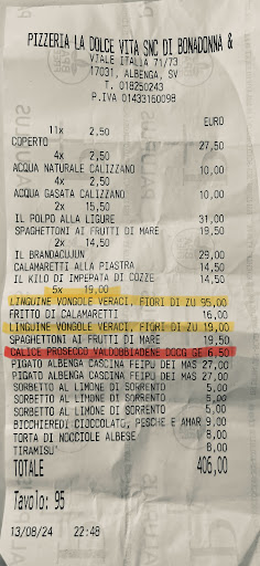Esperienza molto negativa.. prenotato per le ore 20:00 ben 3 giorni prima della cena, durante la prenotazione telefonica ci viene consigliato di venire SE POSSIBILE alle ore 19:30.. ci presentiamo alle ore 19:50 ci viene detto che il nostro tavolo era stato dato ad altri perché eravamo in ritardo, e che la loro politica e che se non ti presenti dopo mezz’ora dalla prenotazione il tavolo non c’è più.. oltre che io ho puntualizzato che eravamo lì prima del nostro orario ma nulla con arroganza e strafottenza il cameriere ci ha liquidato e mandato via dicendo che se volevamo ci trovavano poi un posto dopo mezz’ora un ora… ma cosa io ho prenotato.. ma il fatto grave e il modo e il non rispetto della nostra prenotazione e del fatto che con noi c era un disabile e un bambino che avena fame… comunque pochi metri dopo abbiamo trovato un locale pieno dove la padrona visto la situazione SENZA PRENOTAZIONE ci ha fatto accomodare grazie ristorante PUNTA LENA e nessun grazie alla dolce vita maleducazione al top… aggiungo che noi siamo arrivati da voi alle 19:50 perciò 20 minuti dopo le 19:30 ipotetiche che lei potrà sostenere perciò il tavolo fino alle 20:00 non doveva essere dato ad un altro ed inoltre vi fate lasciare un numero di telefono per cosa ??? Uno piuttosto chiama e chiede se ci sono stati dei problemi e comunque ribadisco che la nostra prenotazione fatta al giovedì per 3 persone e poi cambiata al venerdì per 5 persone mio caro signor Borello era per le 20. E inoltre sottolineo la maleducazione del suo cameriere quando ho fatto presente che erano le 19:50 e la politica della mezz’ora non era ancora passata xcio anche se fossimo in ritardo per ancora 10 minuti il nostro tavolo NON DOVEVA ESSERE OCCUPATO senó cessa lo scopo della prenotazione…. DIMENTICAVO NOI LA PRENOTAZIONE L ABBIAMO FATTA PER LE 20 e voi rimanete degli incompetenti che non siete in grado di gestire una prenotazione e ribadisco che il Vostro dipendente di è comportato da altezzoso è pieno di se… Ma non importa volevo solo ribadire la vostra maleducazione e L avete dimostrata con le vostre risposte.. perché bastava darci un altro tavolo in pochi minuti come dice lei peccato che il suo adorato cameriere ci ha detto che non prima di mezz’ora un ora non poteva e noi eravamo nell’ orario della nostra prenotazione.. o come dite voi noi eravamo nella mezz’ora visto che le 19:50 restano sempre nella mezz’ora… comunque in bocca al lupo per i prossimi clienti che trattate male viva L Italia e viva il rispetto per i disabili e i bambini.. Hahaha mi fa proprio ridere molto educato lei come il suo cameriere almeno vedranno tutti la sua educazione… io poi ripeto ero in orario, non fate più prenotare la gente visto che poi date via i loro tavoli prima dell orario avrete anche 100 coperti e Bla Bla Bla ma non siete in grado di rispettare la clientela… poi io non odio nessuno ci mancherebbe non mi piacciono le prese per i fondelli come ci avete riservato voi tutto li, il rispetto ci va in ogni lavoro e voi non siete stati in grado di essere né seri ne rispettosi con questo è tutto comunque...