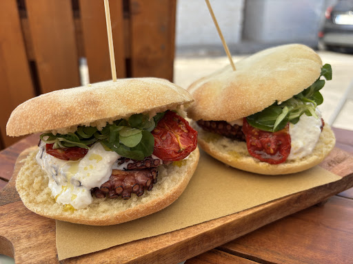 The octopus is slowly cooked for 7 hours with olive oil infused in lemon, served with fresh stracciatella, roasted tomatoes, and some salad. You have to try it. Never tried such a good sandwich our lives.