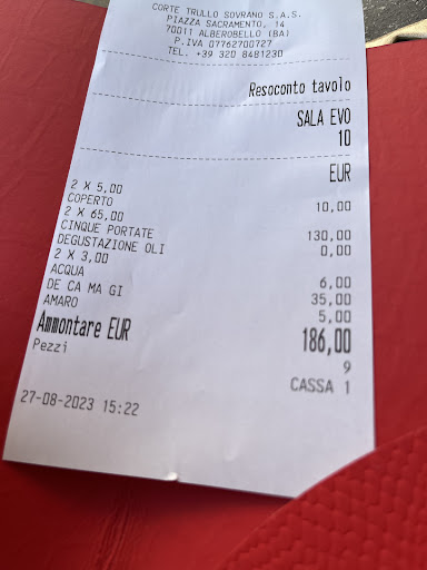 Por lo general no doy reseñas negativas pues el gusto por la comida es muy subjetivo, pero esta vez escribo mientras me “degusto” mi segunda “bustina di gaviscon advance” solo 40 minutos después de dejar el lugar sin siquiera culminar la cena pues se hizo, a mi parecer, incomible. Evo fue una muy mala elección (pues siempre es elección del comensal) entre tantas otras opciones que dejamos atrás en la zona en la hermosa Alberobello.