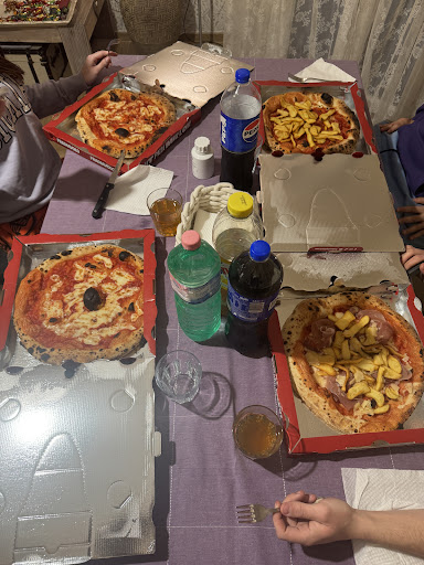 Torniamo a casa, apriamo i cartoni e… sorpresa! Sembra un’estrazione dell’ovetto Kinder: • 2 margherite (una in più del previsto) • 1 salamino piccante e patatine (almeno questa giusta!) • 1 pizza assurda con grana, crudo, salsiccia e patatine (un mix così improbabile che forse in cucina si sono fatti una risata nel prepararla).