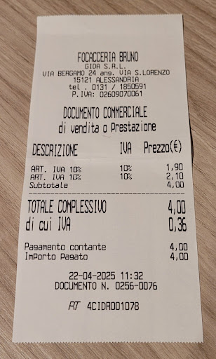 Martedì 22 aprile mi sono fermato a fare colazione presso la Focacceria Bruno in via Bergamo 24 ad Alessandria. Ho preso un cappuccino (€1.90) e una brioche alla crema (€2.10), per un totale di €4.00. La qualità di entrambi i prodotti l'ho trovata non male, ma neanche eccelsa, nella media.