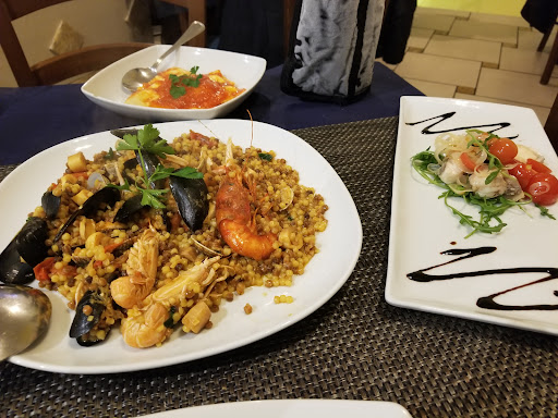 I asked the front desk where I could find family style Italian and they sent me here. Well it was worth asking. The owner "Johnny" is the waiter, the cashier, the busboy, the expediter, and everything else for the front of the house. All he wanted was to make us happy. It started with glass of wine instead of water, and the local bread while we looked at the menu. Then he picked out the best things on the menu. The pics are our appetizers and our shared first course. Monkfish bites were perfect. Firm and easy to handle on the outside, softly cooked in the center. Served with arugala, thin sliced onions, tomatoes, and a delicious light vinaigrette. Homemade raviolis with cream, eggs, and sheep cheese, all local, all fresh. The first course looks like Spanish paella but it has a small pasta the size of corn kernels. Delish. This fusion is part of the 100's of years the Catalans controlled this Sardinian seaport and brought a Spanish influence to the food. I didn't get a pic of the wonderful, fresh, grilled tuna, served simply with lemon slices and arugala. Desert is another nod to Spain. An empanada stuffed wth cheese and drizzled with honey. A bottle of sparkling wine. And several complementary aperitifs finished the meal. A small place with mismatched tables. 80 euros...