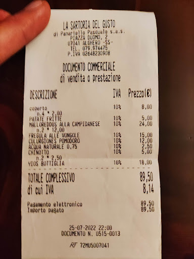 Inizio col dire che siamo andati una sera del weekend del mondiale rally, ci saranno state sedute se va bene 15 persone in tutto, solo un cameriere faceva il suo lavoro. Prendiamo 2 fregola, 3 fritto di pesce, 2 patatine fritte, 1 verdura alla griglia e 1 culurgiones. Dopo un po’ arrivano le 2 fregole (i tempi ci stavano visto la cottura), serviti da una cameriera che non diceva una sola parola, arrivava lì con i piatti e aspettava che noi dicessimo cosa potesse essere e lei non diceva una sola parola, e già qua avevamo capito che forse era meglio se cambiava lavoro; poi sono arrivati due fritti e una verdura alla griglia, per 15 minuti non è arrivato più nulla, dopo sono arrivate due porzioni di patatine che ovviamente uno le ha mangiate dopo aver mangiato il fritto e l’altro ha fatto in tempo a finirle che il suo fritto non era ancora arrivato. Dopo mezz’ora e dopo aver cercato di chiamare la cameriera, che però era occupata a chiamare il gatto che girava e l’altra cameriera che continuava ad andare avanti e indietro con il porta posate di plastica, passa il cameriere che ci aveva preso l’ordine, ha visto che mancavano due piatti ed è andato a vedere cosa fosse successo, dopo 10 minuti è arrivato il fritto che mancava e dopo altri 15 minuti finalmente è arrivato il piatto di culurgiones, fatto sta che da quando sono arrivate le fregole a quando è stato completato il tavolo è passata più di un ora. (Nonostante queste die cameriere passavano lì davanti e facevano finta di nulla) Ora di sparecchiare il tavolo viene tolto via un piatto e poi per 20 minuti più nessuno che sia venuto (puntualizzo che ci saranno state 15 persone in tutto, compresi noi) il cameriere poi fa notare a queste due ragazze che dovevano sparecchiare e portano via un piatto alla volta, 6 giri per portare via 6 piatti e facendo cadere posate su posate. Ora di andare in cassa, il cameriere fa notare i nostri tempi di attesa e la signora in cassa (presumo fosse la titolare) che non abbiamo visto mai in tutto il tempo che siamo stati seduti, non ci ha chiesto nemmeno scusa, nonostante l’attesa e la scocciatura di non aver mangiato insieme perché piatti che sono arrivati a 1 ora di distanza è inaccettabile, oltretutto per nulla economico dato le porzioni che non rispecchiano il prezzo, pensavamo che almeno un po’ di sconto ce lo facesse. Mentre aspettavamo questo conto, il cuoco mette sul “pass”, attaccato alla cassa due piatti, senza suonare o altro, cameriera (la solita muta) che guardava in giro e quei piatti per i 10 minuti che siamo stati in cassa nessuno li ha presi e portati fuori, quindi non so come siano arrivati al tavolo, detto questo, come sconto ci ha fatto ben 0,25€ a testa, fa davvero ridere come cosa!! Ah la cassiera date le poche persone poteva uscire e affiancare le ragazze e insegnargli qualcosa!