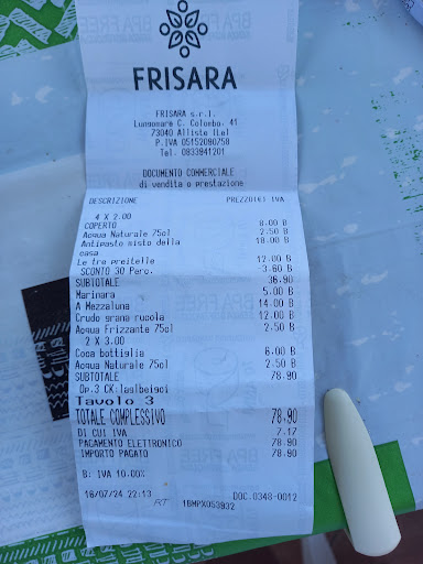 Read moreIl locale ha una bella terrazza vista mare, il personale è solerte e gentile.Eravamo in 4, abbiamo ordinato 1 antipasto misto della casa, 3 pizze ed io, visto le temperature elevate e visto che le frise, dovrebbero, ripeto dovrebbero essere il piatto forte della casa, ho ordinato " le 3 preitelle". Antipasto buono, ma scarso in quantità, costo 18€. Pizza mezzaluna e pizza crudo, rucola e grana con impasto al carbone, ottime veramente. Mio marito ha ordinato una marinara, il cameriere gli ha chiesto che cosa ci volesse sopra, alla richiesta penso normalissima, che ci fosse dell'aglio, la risposta è stata che aglio non ne avevano, ma che se ne sarebbe accertato in cucina. Il risultato è stato una Marinara bruciacchiata con sopra solo dell'olio all'aglio... Arriviamo alla mia scelta, il tris di frise, semplicemente indecenti! Partiamo dalla " sponzatura", erano dei blocchetti di cemento, una in particolare era talmente dura da non essere masticabile. Il cameriere, gentilmente me ne ha portata un'altra, immangiabile pure quella! La mia cena si è limitata al condimento che stava sopra le frise: i filetti di tonno, di qualità scadente, il formaggio, i pomodori secchi, le olive e le cime di rapa, tralaltro sott'aceto. So che è una verdura invernale, ma in molti locali salentini, le scottano e le congelano al naturale, per essere consumate anche in estate. Al momento di sparecchiare il tavolo i camerieri si sono accorti che in pratica non avevo cenato e ci hanno assicurato che avrebbero stornato dal conto l'intero costo del mio piatto. Abbiamo più volte chiesto un terzo litro d'acqua che non abbiamo mai ricevuto ma che ci è stato messo in conto, oltre alle mie frise, che ci hanno fatto pagare scontando del 30%. Purtroppo ieri sera ci siamo fidati del personale e scioccamente non abbiamo controllato lo scontrino che posto con la recensione. A mai...