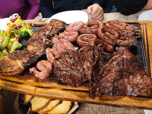 Siamo stati qui a mangiare usufruendo della formula dell' all you can eat. E qui sorge già una premessa da fare, c'è gente che potrebbe mangiare da fare schifo e approfittare del prezzo tutto sommato interessante (18euro). Noi abbiamo mangiato abbastanza, c'erano due donne e tre uomini, penso che abbiamo mangiato il giusto. All'inizio ci hanno portato un tagliere di salumi e formaggi... In realtà il plurale è un po' sbagliato, dato che di formaggio c'erano solo 4 pezzi di primosale (o similare) e i salumi erano due (appena abbastanza per il plurale).. ma devo dire che il salame era in media e l'affettato, penso una fesa di maiale stagionata, anche qui, non ho chiesto conferma) mi è piaciuta abbastanza, anzi, direi buona, la rimangerei volentieri. Una nota positiva va anche al pane a malapena abbrustolito. Poi sono arrivati dei carpacci, buoni, ma sicuramente fatti nel pomeriggio in fase di mise en place e poi messi in frigorifero, cosa anche giusta, ma avrebbero giovato di una temperatura di servizio leggermente più alta, così da esaltarne il sapore. Nota a margine, io chiedo sempre del limone quando vado alla braceria e, puntualmente, mi arriva quasi a fine cena... Qui mi è stato portato subito, può sembrare una cavolata, ma l'attenzione ai bisogni del cliente sono importanti. Dopo abbiamo ricevuto un polpettone con salsa aurora.. qui, purtroppo, mi è scaduta un po', la salsa era acidognola e la carne... Bhe, non ci è piaciuta.. ma qui vorrei fare un appunto. La carne era macinata finemente e dalla cottura uniforme, però si sbriciolava in bocca. Ora, io potrei fare un ipotesi che spero sia smentita, ma sono anche io un cuoco e conosco la consistenza di una carne macinata gia cotta e poi messa insieme, magari con l'aiuto di qualche uovo... E cotta nuovamente. (Non mi sbilancio oltre, ma le valutazioni da fare sono ben evidenti). Poi veniamo al sodo, la brace. La carne era come ce l'aspettavamo, media, ne lode ne frode, tagliata, costata, salsicce, bombette... La cosa che abbiamo gradito meno era l'hamburger, con sopra il Philadelphia (ormai il Philadelphia sta diventando l'emblema dell all you can eat). La carne era palesemente fatta allo stesso modo di quella citata sopra per il polpettone. Meglio soprassedere. Poi ci è stato portato un piatto di straccetti con grana, rucola e aceto balsamico... Forse troppo balsamico, tanto da farla sembrare dolce.. non li ho graditi molto, ma vabbè. Dopo, il cameriere, ci ha chiesto se volessimo altra altra carne, abbiamo chiesto solo un altro po' di salsiccia e tagliata. Che sono arrivate puntualmente e noi abbiamo mangiato con gusto, anche queste erano abbastanza buone come quelle del primo tagliere. Poi abbiamo concluso con un amaro ed un limoncello che ci sono stati lasciati sul tavolo, immagino che qualcuno possa abusare di questa offerta, noi abbiamo bevuto solo un bicchierino a testa. Purtroppo devo dire che il limoncello era un po' annacquato (cosa che il mio amico ha gradito, non amando i sapori forti), mente l'amaro è stato lasciato da tutti. Non so che amaro fosse, forse fatto in casa, c'era un sapore preponderante di bacche di ginepro e chiodi si garofano, o per lo meno così sembrava.. purtroppo non nei nostri gusti. Fine cena, 25 euro a testa circa.