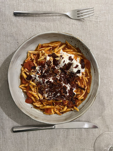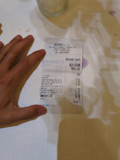 Na miejscu przywitał nas kelner i już tutaj pierwsze pozytywne zaskoczenie, mówił płynnie po angielsku, s w Altemurze to rzadkość. Posadzono nas w przyjemnym wnętrzu, niedawno odnowionym. Karta była krótka ale zróżnicowana. Wybraliśmy przystawki Mo é i dwa makarony, jednak kelner zaproponował nam danie spoza karty - długogotowanego osła z warzywami. Finalnie decyzja padła na przystawki, makaron cavatelli ze stracciatella, osła i wino domu. Był to strzał w dziesiątkę! Do przystawek podano nam lokalny chleb będący doskonałym dodatkiem do dań z sosami etc. Produkty były najwyższej jakości - bardzo ciekawy był kiszony bakłażan. Dania główne podane były na eleganckiej zastawie. Makaron posiadał ciekawe kontrasty - gorący sos i zimny ser, kremowy sos, miękki makaron i chrupiąca papryczka - coś wspaniałego! Długogotowany osioł był miękki i pełen smaku. Wino było słodkawe ale smaczne. Na deser dostaliśmy ciastko na ciepło - brudne usta/sporca nuss - proste i smaczne.