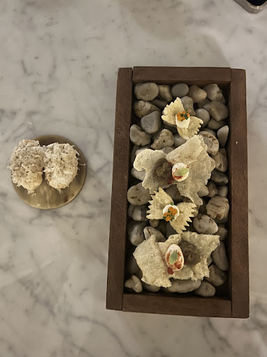 Setting aside this outdated strange sexist behaviour, the setting is nice (albeit a little dated and gaudy for my personal tastes and with just a small glimpse of the water), and the Chefs appetisers were presented nicely and clearly prepared with some skill. My cocktail was disappointing and tasted just of mango juice, although my partners cocktail was nice, if unremarkable.