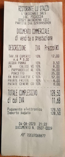 Arriviamo in sei (due bambini) con prenotazione alle 21, ma il maestrale ci porta a rinunciare a cenare all'aperto, ed è un peccato. Così ci viene assegnato un tavolo all'interno in una sala poco affollata. Ci accomodiamo, ci portano i menù e restiamo in attesa che qualcuno venga a prendere l'ordinazione. Dopo circa 20 minuti, un cameriere viene a prendere un menù perché serve ad un altro tavolo. Dopo altri 5 minuti ne passa un altro e chiede se l'ordinazione sia stata fatta. «No.» «Vi mando subito qualcuno.» All'alba dei 40 minuti di attesa, un po' incazzato mi alzo e vado a cercare quel qualcuno. L'idea funziona e possiamo ordinare: «Due salsicce con patatine per i bambini...» «Allora le facciamo uscire subito!», dice la signora. Perfetto, così i bambini mangiano subito, no? No, perché dopo un po' arrivano le patatine senza salsiccia insieme a due antipasti, due primi e una bottiglia di prosecco (che ci fanno assaggiare). Noi adulti ceniamo, ma le salsicce sono letteralmente sparite, tanto che i bambini si arrangiano mangiando qualcosa dai nostri piatti. Nei miei chiusoni, tra l'altro, trovo la carta del formaggio (vedi foto). All'ennesimo sollecito, le salsicce arrivano, ma oramai si sono fatte le 22 e 15. La richiesta di una seconda bustina di maionese cade nel vuoto più buio e profondo. A seguire arrivano i nostri secondi: 2 maialetti alla brace e due filetti con contorni, solo che dei quattro contorni ne arriva uno solo (le mie patate alla cenere, praticamente tre patate bollite). In attesa dei contorni che facciamo? Iniziamo a mangiare la pietanza e ordiniamo un altro prosecco, che stavolta non ci fanno assaggiare e difatti, appena mia figlia lo avvicina al naso (e mia figlia non è certo Veronelli) "sa di tappo". Non esageratamente, ma è così. Preferiamo tacere su questa cosa mentre sollecitiamo ancora i contorni mancanti che arrivano a pietanza quasi terminata. Nulla da dirsi sui dolci, sul cibo in generale e nemmeno sul conto, assolutamente normale. Però il trattamento e il servizio sono stati del tutto...