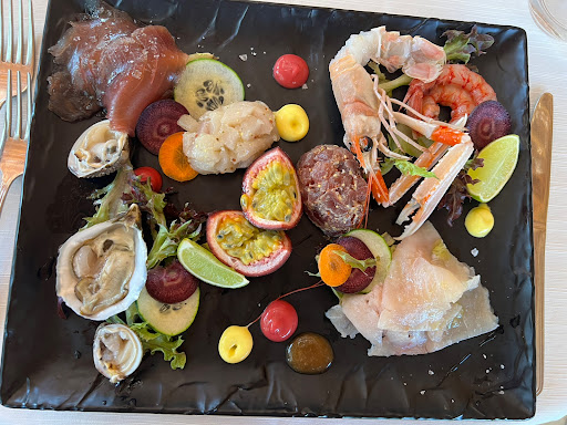 Trop cher pour ce que c'est (mais cela se comprend, c'est le restaurant d'un hôtel 5*), et gustativement moyen. Mais ils sont honnêtes (voir plus bas). Le cadre est joli, l'extérieur est très joli comme on peut le voir sur les photos. Le personnel est passablement aimable, le minimum syndical dirons-nous. Pas désagréable, mais rien de particulièrement sympa. Pour les plats... Pas de pizzas le midi. Vous êtes prévenus. L'assortiment de produits de la mer grillés est préparé (imparfaitement : arêtes restant, et un petit peu de gâchis sur le poisson) devant vous. Les gnocchis sont dits "fait-maison". Je préfère de très très très loin les gnocchis à poêler d'une marque très connue qu'on trouve en supermarché. Attention à la (petite...) assiette de frites à 5€ : elles sont très salées, ce qui n'est pas sain du tout. Pour le dessert, nous avions commandé un tiramisu et une crème brûlée (qu'ils appellent "catalana"). La crème brûlée était correcte, le tiramisu était immangeable. Nous l'avons renvoyé, et ils ont été assez honnêtes pour ne pas nous le facturer, et reconnaître qu'il était "un peu sec" (mais en fait il n'était juste pas bon, c'est tout, vraiment pas bon). Nous l'avons remplacé par un "assortiment du chef" que ma compagne a trouvé décevant. Elle en a laissé la moitié. Le tout est cependant correctement présenté. C'est donc + joli que ce n'est bon. Par contre, encore une fois : pas de couteau à poisson. Étrange pour des restaurants d'hôtels 5* qui sont isolés sur une île... Etant végétarien à tendance végétalienne, je n'ai pas particulièrement apprécié de voir les homards, écrevisses, et araignées de mer, entassés les uns sur les autres dans un micro-aquarium au centre de la pièce, et encore moins de voir un serveur jouer avec deux d'entre eux (les sortir de l'eau en les tenant par une antenne puis les relâcher, et ceci à plusieurs reprises, un sourire sur le visage quand les pauvres bestioles se tortillaient dans tous les sens). Les toilettes sont propres. Ah et j'ai commandé un café, mais on m'a amené un ristretto. Attention donc à être bien précis dans vos demandes ! Ne vaut clairement pas la note que l'on avait vue sur Google et qui nous avait donné envie de l'essayer.