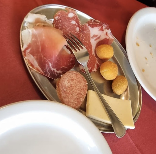 Sono rimasta davvero perplessa quando abbiamo ricevuto l’antipasto PER DUE PERSONE composto da due olive, due mozzarelline, 2 fette di bresaola, 1 rondella di ciauscolo, 1 fetta di prosciutto e 1 fetta di formaggio. Prezzi direi spropositati per ciò che mangi. La carne era buona, lo spezzatino di maiale con mele rosa era buono ma pari ad un cucchiaio messo sul piatto. 57€ per l’antipasto che vedete in foto e due secondi 😂 perplessi è la parola giusta per descrivere questo pranzo. Ah in tutto ciò lo scontrino fiscale non è contemplato ma ho ricevuto solo la stampa del pos. Quindi non so nemmeno quanto ho pagato quel piattino misero...