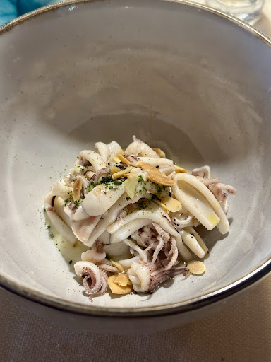 E’ ormai passato qualche giorno da quando io e Paola abbiamo festeggiato il nostro 34° anniversario a cena da Pescarino, un ristorante vicino a Montemarcello nel comune di Ameglia. Un locale semplice, legno a vista, quasi una baita di montagna, ma a due passi dal golfo dei Poeti e dal suo splendido mare. Situato in collina, si trova percorrendo la strada panoramica che da Montemarcello porta a Lerici, per poi deviare dopo l’abitato di Zanego in una strada secondaria verso monte. Certo la location non è facile da raggiungere e prima di arrivare al parcheggio c’è da percorrere in salita una via particolarmente stretta. Non è quindi un locale per chi capita per caso ma solo per coloro in grado di apprezzare la cucina dello Chef e patron Gabriele Rastelli. Dal parcheggio si sale percorrendo a piedi, per qualche decina di metri, una strada sterrata debolmente illuminata, fino a trovare una bassa costruzione che ospita il ristorante. Entriamo…. siamo in leggero anticipo ma subito il maitre con grande cordialità ci accompagna al tavolo che scegliamo come primi avventori della serata. L’ambiente è piccolo, intimo, caldo, accogliente. Ci troviamo avvolti dal legno, un bel camino in pietra davanti a noi, luci soffuse ovunque, si respira un’atmosfera romantica che ci fa sentire a nostro agio, felici e piacevolmente sorpresi della scelta fatta. Nel frattempo ci viene portata l’acqua, il pane fatto dalla cucina, il menu e la carta dei vini. Interessanti i piatti in carta che sembrano avere sicuri riferimenti nella tradizione locale ma con variazioni intriganti. Per meglio conoscere la cucina di Gabriele Rastelli (che poi sapremo essere assente, sostituito dal sous-chef), concordiamo due menù degustazione uno di mare e l’altro di terra (rispettivamente € 50 e € 48). La carta dei vini non sembra particolarmente ampia, ma con scelte meditate, in grado di soddisfare anche l’appassionato. Da parte nostra, visto l’eterogeneità dei piatti scelti scegliamo l’offerta vino al bicchiere. Iniziamo con il benvenuto dello chef: una “Zuppetta di pesce con crostino fritto” servito in una padellina di alluminio accompagnato da un bicchierino di “Americano“. Assaggio molto piacevole che stimola i nostri sensi e ben ci predispone al nostro viaggio gastronomico. Iniziamo con gli antipasti: “Calamaretti su crema di zucca e mandorle tostate”, freschissimi i calamaretti, piacevole l’abbinamento. Giudizio: (eccellente-) e “Tartare di Fassona su salsa di mele e dressing di bufala”. Giudizio: (ottimo++), a seguire “Soufflè di Seppia con il suo nero su ricotta calda”. Giudizio: (buono++) e “Degustazione di salumi di Castelnuovo Magra – Prosciutta, Chiarella di lardo, Mortadella nostrale”, eccellente la Prosciutta e la Chiarella. Giudizio: (Buono+)A seguire, dopo un giusto intervallo ecco i primi: “Spaghetti ai ricci di mare e zenzero, affumicati al faggio”, di grande effetto scenografico la presentazione, piacevole il piatto. Giudizio (ottimo-) e “Ravioli di burrata cacio e pepe”. Giudizio: (buoni++). Proseguiamo con i secondi: “Filetto di ombrina con fagiolini verdi e tartare di pomodori grigliati”, fagiolini di non eccelsa qualità, molto buona la tartare di pomodori. Giudizio: (buono-) e “Faraona confit con vellutata di zucca”. Giudizio: (discreto). I vini in accompagnamento Bianco di Moneta IGT Costa Toscana 2018 e Il Selvatico Cuvée rosso Montecarlo (LU) non particolarmente apprezzabili. Infine il dessert uguale per tutti e due: “Coppa di frutta esotica con crema di cocco”, fresco, equilibrato, forse di sapore troppo estivo non perfettamente adeguato a questo autunno piovoso. Verranno accompagnati da un buon Picolit DOCG di Zuccolo offerto dal maitre. Giudizio: (Buono+). Chiudiamo con il caffè. Quella di Gabriele Rastelli, anche se questa sera non abbiamo avuto la fortuna di apprezzarlo direttamente, è una cucina lieve, delicata, equilibrata, dai sapori semplici ma gustosi e che eccelle per la grande cura nella selezione dei prodotti impiegati. Piacevoli le presentazioni dei piatti. Servizio cortese, attento e...
