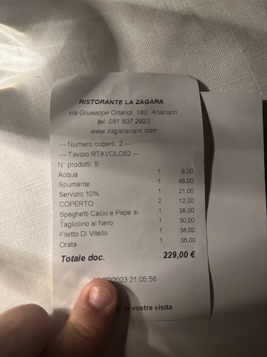 i've been traveling in italy for a month solo, and hands down this was the only truly bad food experience i've had. from the moment i walked in i felt out of place, staff was not warm or welcoming and seemed to see my table of one as an inconvenience. the menu was limited and expensive, which i am fine with if the meal is worth it! this was not. my reservation was for 8 pm, i was served and handed a bill for €52 at 8:17 pm. i ordered water (€6), wine (€12), and a pasta dish that featured pumpkin and octopus (€28) plus a table service charge for an additional €6 (charge is not uncommon but this is high). I asked two waiters if there was tomato in the dish and both said no without being able to explain the dish or the way the octopus was prepared. The meager portion arrived with tomato, which i never pair with seafood, and i decided it was easier to eat the few bites than to try and get the staff to pay attention. It was the most expensive dish and smallest portion i've received in Italy, and as a rule of thumb these are not the types of restaurants i'm interested in, but again I'm willing to pay for amazing quality and service. Neither of those exist at La Zagara. The atmosphere is aesthetically nice if you remove the vibe given off, but that was the only positive. I received a bill 17 minutes after being seated, i still had a bit of wine and a full bottle of San Pellegrino at the table. I asked a waitress where the bathroom was (i had not yet paid), and when i returned my table had been cleared. The restaurant wasn't too busy, so this was truly a careless act. I was very uncomfortably with the whole experience, i asked a server where my table went and there was mass confusion like they hadn't even realized i didn't pay yet. they brought my water bottle back from the kitchen and offered it back to me, to which i said no thanks ill just pay but please remove that from the bill. I left right away to find somewhere else to get a proper meal, upset that i had just spent time and money at La Zagara. I reached out to management to explain my story and his response was that i can come back and try again... no thanks for spending another minute of my few days on Capri there. I explained not enjoying the food was a secondary complaint, my real issue was with the service and being rushed out. He admitted an issue with service but offered nothing worthy seeing as i would not want to spend more of time here returning to a place i felt so unwelcome. Unless you are looking for a careless, overpriced and underwhelming dining experience, i do not...