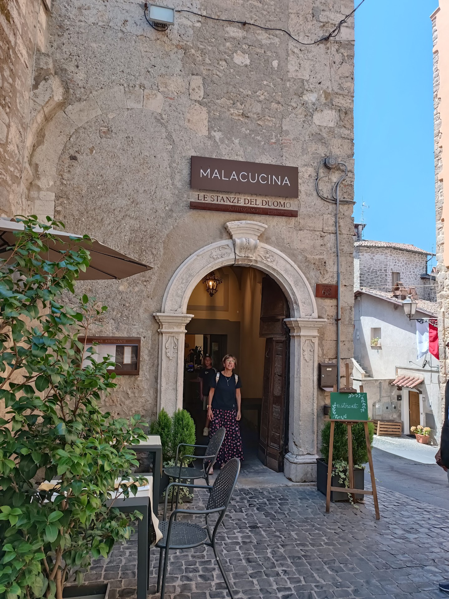 Read moreHo pranzato oggi in questo piccolo ristorante situato dentro la cinta muraria e vicino all'ospedale; conviene parcheggiare vicino a quest'ultimo, e fare due passi. Primo bonus e' stato l'accoglienza, gentili le due signore, cosa che non e' proprio cosi scontata. Secondo bonus, lo chef alla fine del pranzo si e' assicurato che tutto fosse andato secondo le mie aspettative. Terzo bonus l'ambiente, antiche camere con soffitti a volta, decorati; pavimento in cotto, forse ancora originale. Abbiamo mangiato 1 tonno di coniglio accompagnato con maionese, e 1 tagliere di formaggi e salumi locali. Poi: 1 spaghettone di gragnano alla colatura di alici di Cetara con piccoli pezzi di pan fritto; 1 spaghettone con baccala' e peperoni cruschi di Senise. Infine 1 panna cotta alla liquirizia, non proprio commerciale, e 1 crostata alle ciliegie aspre di Modena. Vino rosato di Affile da uve di cesanese. Acqua frizzante in caraffa e caffe'. Conto nella media, €76 in due ed omaggio di grappa. Il menu mi e' piaciuto, poche cose (indice di cucina espressa), ma centrate, e si spazia dal Piemonte alla Basilicata con mano leggera. Questo locale ha un futuro roseo, ed i cortesi gestori se...