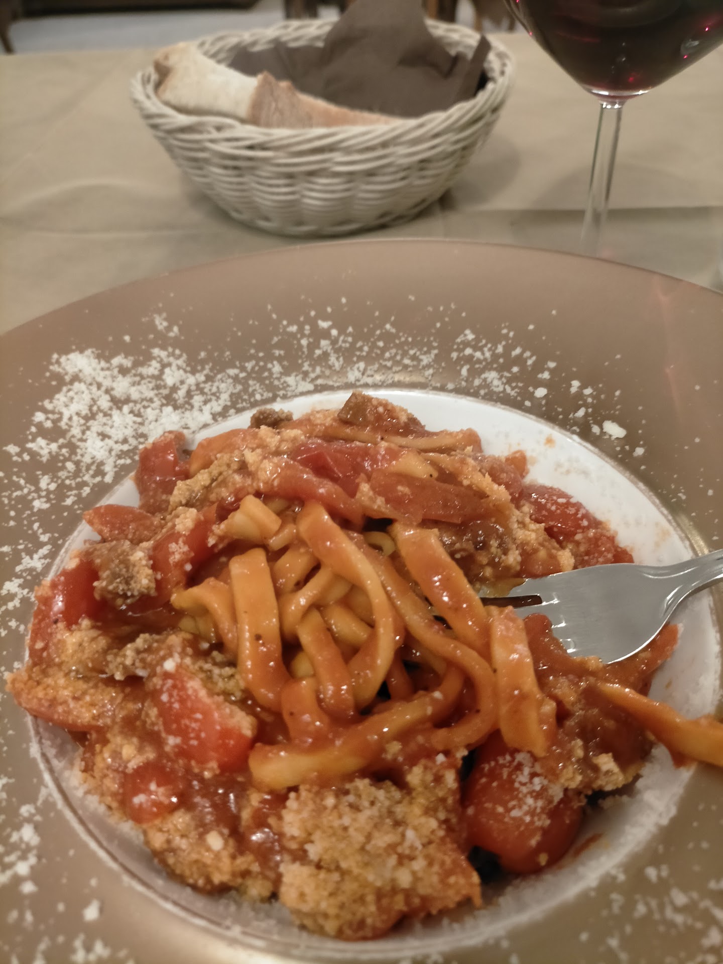 Ho fatto sosta ad Anagni (ritornata dopo 40 anni), per un viaggio dal nord al sud. Ho cenato da sola con me stessa e con l'accoglienza discreta e attenta allo stesso tempo del personale. Ambiente molto gradevole e arioso, con tavoli ben distanziati l'uno dall'altro. Ho preso un primo: la loro 'rivisitazione' dell'amatriciana con pomodorini datterini e fettuccine anziché bucatini. Squisita! Da leccarsi 'modestamente' i baffi 😉. Un calice di vino rosso del territorio, morbido e palatabile, buon retrogusto, e una cicoria ripassata in padella con aglio e peperoncino. Gentilezza di accoglienza: un entrée generoso di panzanella, genuina e che richiama agli antichi sapori della tradizione e gentilezza dei saluti (mentre stavo già lasciando il tavolo per andare a pagare e il gestore mi ha fermato): biscotti della casa a base di cioccolato fondente e miele, friabili leggeri e il giusto grado di dolce non stucchevole. Di rado si incontra un garbo e un'attenzione di questo tipo, o almeno a me non capitava da tempo. Le porzioni sono abbondanti. Anche i secondi che ho visto sfilare agli altri tavoli mi sono parsi belli e buoni. Ho provato un sapore di casa per il cibo fatto con amore e se ripasso in questa splendida cittadina che è Anagni, mi fermerò di nuovo qui per provare e gustare altri piatti della tradizione. ps: Per la cronaca il coperto/servizio costa solo 1 €, che mi pare una favola trattandosi di ristorante. A Bologna, dove vivo, mediamente costa € 2.5 o 3. I prezzi invece dei primi forse sono un po' alti, ma proporzionati per qualità e quantità....