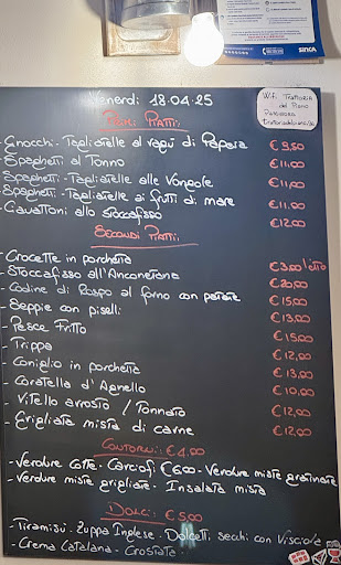 Trattoria/Osteria in tutto tranne il prezzo. Questo praticamente, come pochi altri, rappresenta l’ultimo baluardo della anconetanità nnerta e cortese che è rimasta in provincia. Solo il sentire il dialetto che vaga tra i tavoli, vale il prezzo del biglietto. Pochissimi tavoli all’interno pochi anche all’esterno ma basta chiamare Prima per essere soddisfatti(anche in giornata). Servizio molto piacevole, impeccabile con battutina (o senza) fa sempre piacere pranzare in ambienti così veraci! Se cercate la formalità, la finezza, piatti stellati ma vuoti dalla vera popolarità di una città allora non ci andate. Siamo stati a pranzo in un giorno infrasettimanale abbiamo preso degli spaghetti alle vongole (concole) e pasta corta allo stoccafisso. Frittura mista senza spine, seppie coi biselli, acqua, vino della casa e due dolcetti. Probabilmente devo rivedere Io tutta la questione dell’aumento dei prezzi e valutare il fatto che si è in pieno centro della vera ANCONA (al Pià), ma il prezzo pagato alla fine non è da Trattoria. A parte questo...