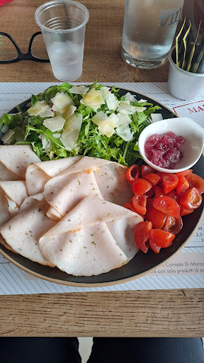 siamo entrati per disperazione alle 14.40. essendo più simile a un bar volevo evitarlo. immaginavo primi decongelati, un pianto. menù con soltanto 2 ( due!) primi e 3 ( tre!) secondi/ piatti unici , questi entrambi con bresaola , quindi freddi. abbiamo preso quel che c'era: 1 tagliolino al farro/ mirtillo con pomodorini gialli e rossi e funghi champignon e un primo di tonnarelli cacio e pepe. e 1 bresaola con insalata parmigiano e taggiasche. per pane un sacchettino di striscioline di pinsa.
