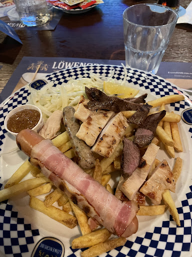 AGGIORNAMENTO: sono stato a mangiare a cena, da 4 salgo a 5 stelle! Il locale era sostanzialmente pieno, servizio molto veloce, personale molto molto cordiale e disponibile. Abbiamo preso, in 5, due taglieri di antipasto (il fumè è quello bavarese se non sbaglio, con verdure miste e salumi nei taglieri, 5 brezel salati, 2 birre piccole e 2 medie, acqua, un panino a testa del menu con patate incluse, caffè. Abbiamo speso 22 euro a testa. Un prezzo onesto direi, soprattutto per quello che abbiamo mangiato! Le porzioni sono ottime, soprattutto dei taglieri. Con quelli e il brezel abbiamo fatto mezza cena quasi, erano molto buoni tra l'altro. Panino abbiamo preso il Dortmund, con hamburger da 200g, ma veramente buonissimo! Paragonando ai ristoranti simili in zona, cioè McDonald's, Roadhouse, America graffiti e Old Wild West, secondo me solo quest'ultimo se la batte in termini di qualità dei panini. Qui da lowengrube molto molto buoni e farciti, a differenza di quelli di America graffiti per esempio che sono decisamente più sconditi e "vuoti" dentro. Alla fine non siamo riusciti a finire le patate fritte, anzi le abbiamo appena spizzicate. Ci tornerò sicuramente in un'altra occasione per provare qualche vera specialità tipo lo stinco o altre...