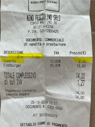 Read moreSabato scorso, io e la mia compagna, siamo capitate davanti a questo locale verso ora di pranzo. Scegliamo dal menu affisso fuori e decidiamo di ordinare un panino da asporto (eravamo di fretta per un appuntamento). Note positive: tempi di attesa brevissimi (non più di 10 minuti); panino buono (Nino Fishburger). Nota negativa: la disonestà del proprietario (?) nell’addebitarci il coperto pur trattandosi di un ordine da asporto che, per inciso, non comprendeva né posate né tovaglioli, solo un sacchetto di carta (ordine fatto di persona sul posto, non tramite piattaforme di Deliveroo o telefonicamente)…addirittura il coperto è stata calcolato per due persone nonostante abbiamo ordinato un solo panino (immagino perché abbiamo varcato la soglia del locale in due). Ovviamente non ne faccio una questione economica (2€ non mi cambiano la vita), ma di principio: pagare il coperto per un take-away non mi era mai successo prima e dimostra solo la pochezza della gente.