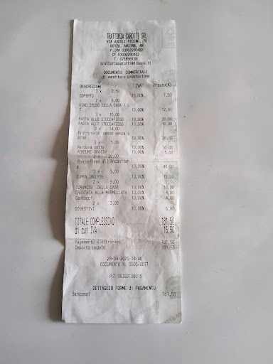 In sintesi, la Trattoria Carotti è un'ottima scelta per chi cerca un'ottima cucina tradizionale in un ambiente semplice ma accogliente. Con piatti come lo stoccafisso all'anconitana e le tagliatelle che meritano sicuramente una menzione speciale, è un luogo ideale per gustare specialità locali preparate con passione...