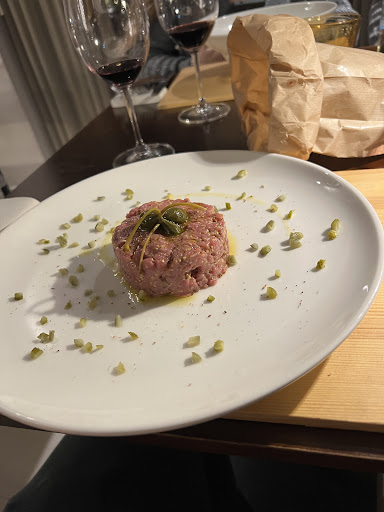 Luogo incantevole e bella atmosfera, soprattutto per una cena romantica o anche per stuzzicare qualcosa in compagnia in un’atmosfera raffinata. Il menù non è molto ampio, ma in fondo, il locale è soprattutto incentrato nei vini e stuzzicherie varie, perciò non si può definire propriamente ristorante. Io ed il mio ragazzo abbiamo ordinato 6 portate: io uno spiedino di polipo, due linguine cacio e pepe per entrambi, lui una entrecote di manzo con abbinate patate e un pomodorino al forno e per concludere due tortini al cioccolato. Come bevande abbiamo preso due calici di passerina e una bottiglia d’acqua. A parer mio lo spiedino era davvero ottimo e il pesce di ottima qualità, la cacio e pepe anch’essa molto buona ma prezzo sicuramente non basso (13€) , l’entrecote era a parere del mio ragazzo molto buona, e la carne di ottima qualità, mentre le patate (che ho assaggiato anche io) purtroppo risultavano quasi crude... Il dolce era veramente ottimo e ci è arrivato con una salsa al lampone è un lampone che facevano un ottimo contrasto con il tortino. Il vino ovviamente era ottimo, ed il prezzo finale per due persone è di circa 80€. (Alcune foto sono sfocate perché ho dovuto fare...