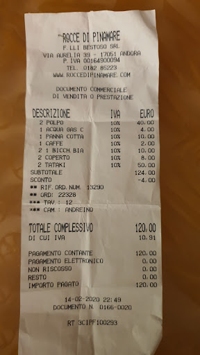 Read moreArriving late for 9pm (Italians do eat very late dinner) with reserved table at this fabulous location above Andora. The table was outside and the view was really great. Just awesome area. First we got a free bottle of prosecco which was a nice gesture - we ordered a series of starters, main courses and deserts, especially the sea food was really great - however; the meat which some of our 12 people group had was terribly made; Dry and almost cooked through even asked for med-rare. at the end, the bill was around 650 Euro with lots of wines, proseccos and grappas too was acceptable - but still, disappointed about the meat.