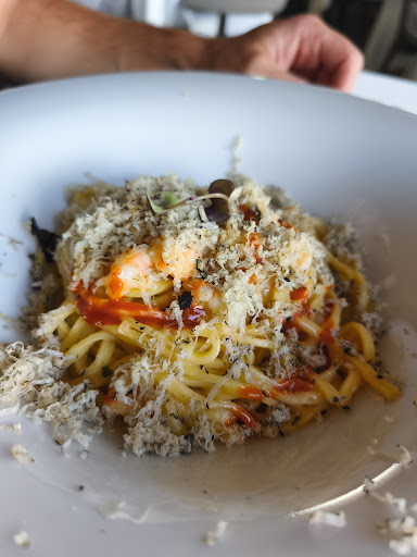Stunning location facing the lake for gourmet dishes in Anguillara Sabazia. A work dinner that has satisfied all the diners. Modern location with breathtaking views of Lake Bracciano and, accommodated under the gazebo Mise En Place is cured, with fabric tablecloth and glasses suitable for wine served (we chose a high prosecco Brut "Bareta" 11.5% merotto). The service is fast and punctual. As an appetizer we chose "pastellated pumpkin flowers with mortadella, ricotta of sheep and red shrimp of the raw Mediterranean" and a "smoked tuna with mayonnaise with basil, frisella crumbled, stracciatella, talli d 'Garlic and tomatoes Marinda". Jump the first to pretend to be a diet, for a good and abundant "frying of Totans and Mediterranean shrimps". Under dessert a delightful delightful of "charm, ricotta and tart". We could not stop, so we decided to end with a "bitter of the boss" and coffee. Account? 160 €. Good proposal! Scored on the map to return! Beautiful experience! The restaurant also has a mascot: the Mizzy cat! Tender...