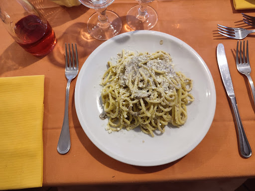 A family run restaurant with a nice vibe. The best ravioli we've had in Italy. The other pasta was also very good. The only disappointment were the veggies, as they were served rather cold and after a long wait - a plate of spinach, another one of artichokes, and mixed salad. Coffee and pan dell'orso for dessert was great. We visited for lunch on Sunday and were very lucky to get a table. Reserve ca 1.5 hours for a meal, as the food is freshly prepared and the staff is not in a hurry (they also speak almost no English, but you...