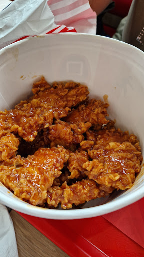 Read moreAndato svariate volte in questo kfc e ne sono rimasto abbastanza deluso, tempi d'attesa al drive molto lunghi nonostante ci fossero poche persone all'interno. Ho ordinato tramite app e mi sono presentato alla cassa alle ore 22.37, mi è stato consegnato il pollo cucinato durante la giornata quindi terribile da mangiare: Gommoso e totalmente riscaldato (ho preso menù : 2 krunchy, 4 tender crispy, 2 bibite e 2 patatine a 9.90€) prezzo comunque onesto se non fosse comunque per la qualità che mi è stata data in quel momento. Per non parlare di un altra occasione sempre al drive dove attendevo il resto e la ragazza mi ha guardato male e mi ha chiesto cosa volessi in maniera sgarbata. (Aspettavo solo i 10€ di resto) Ci sta la disattenzione ma almeno un : "mi scusi per la svista ". L'ambiente è piccolo però abbastanza ospitale si vede che è stato costruito molto velocemente mi è capitato di vedere delle scritte che cadevano dal muro e la porta d'ingresso non era già funzionante dopo poche settimane dall'apertura.Non sono sicuro che continuerò a frequentare...