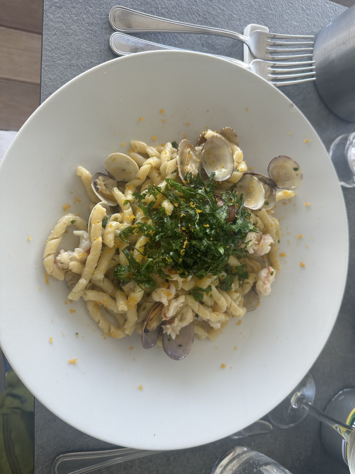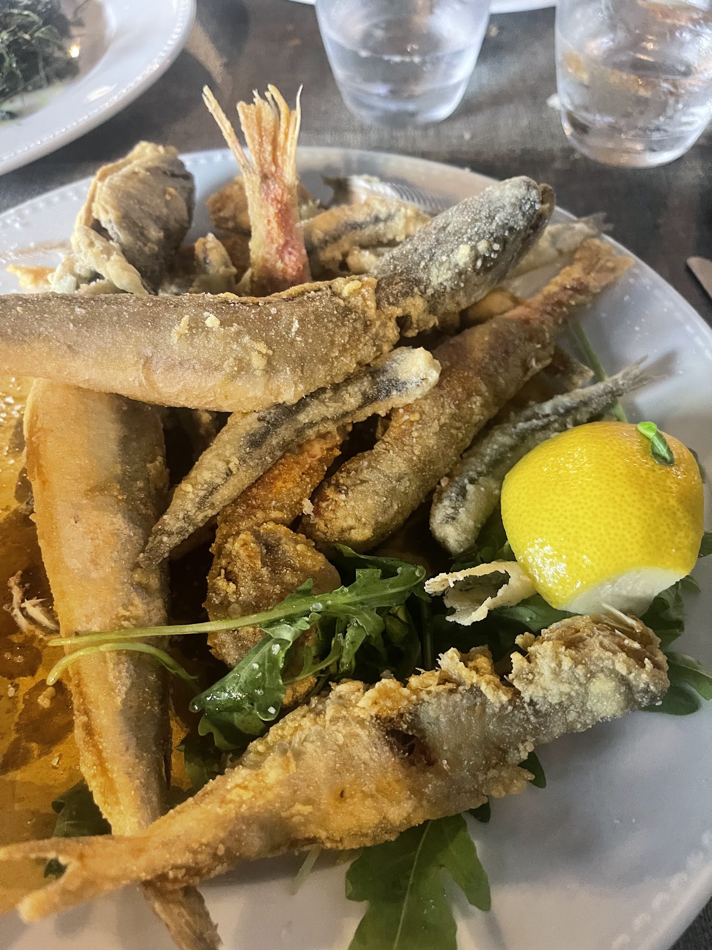 La frittura di paranza, un classico che spesso può sembrare scontato, qui si trasforma in una sinfonia di sapori e texture. Mai avevamo assaggiato qualcosa di simile: il pesce, freschissimo, è avvolto da un’impanatura leggera come una nuvola, che non copre ma esalta la purezza del mare. Il risultato è una frittura asciutta, croccante, che lascia il palato pulito e desideroso di un altro boccone.