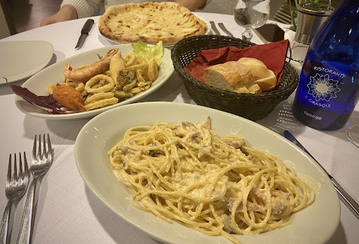 Not bad actually. During the week day, there aren’t many restaurants open in this city, so we took a look in the city and found this one in a small street. We thought just give it a try. After entered, there were many people dining there, so it must be good. And we order a carbonara and a pizza with tartufo oil and parmigiano. With fried seafood aside. The pasta was so great that my friends ate every bit of it, and the pizza was fairly oil and delicious. It was thin but full of the favor of tartufo, very nice and good! But the service there was not that perfect, the waiter who lead us in is pretty cold and no patience. But the waiter who served foods was really a sweet and warm guy with very...