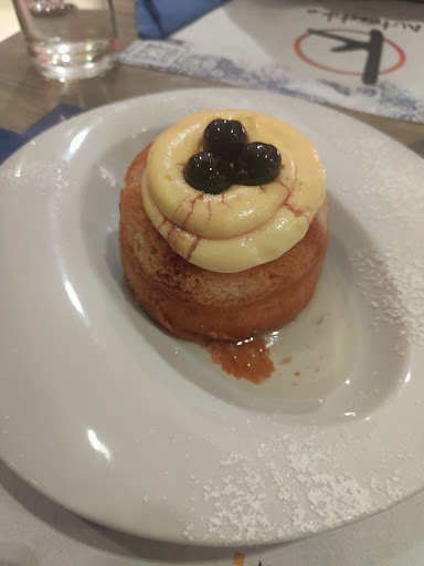 Non si può concludere senza un dolce. La scelta è ampia, tra cui quello del giorno. Opto per una sorta di mini savarin con crema e amarene: davvero ottimo negli ingredienti, anche se la bagna l’ho trovata un po’ troppo dolce, considerando che già tutto il dolce tende al dolcezza. Avrei gradito una nota più amara o aspra, magari con delle gocce di cioccolato fondente nell’impasto. Inoltre, la bagna non era affatto alcolica – scelta comprensibile, vista l’attenzione odierna al tema...