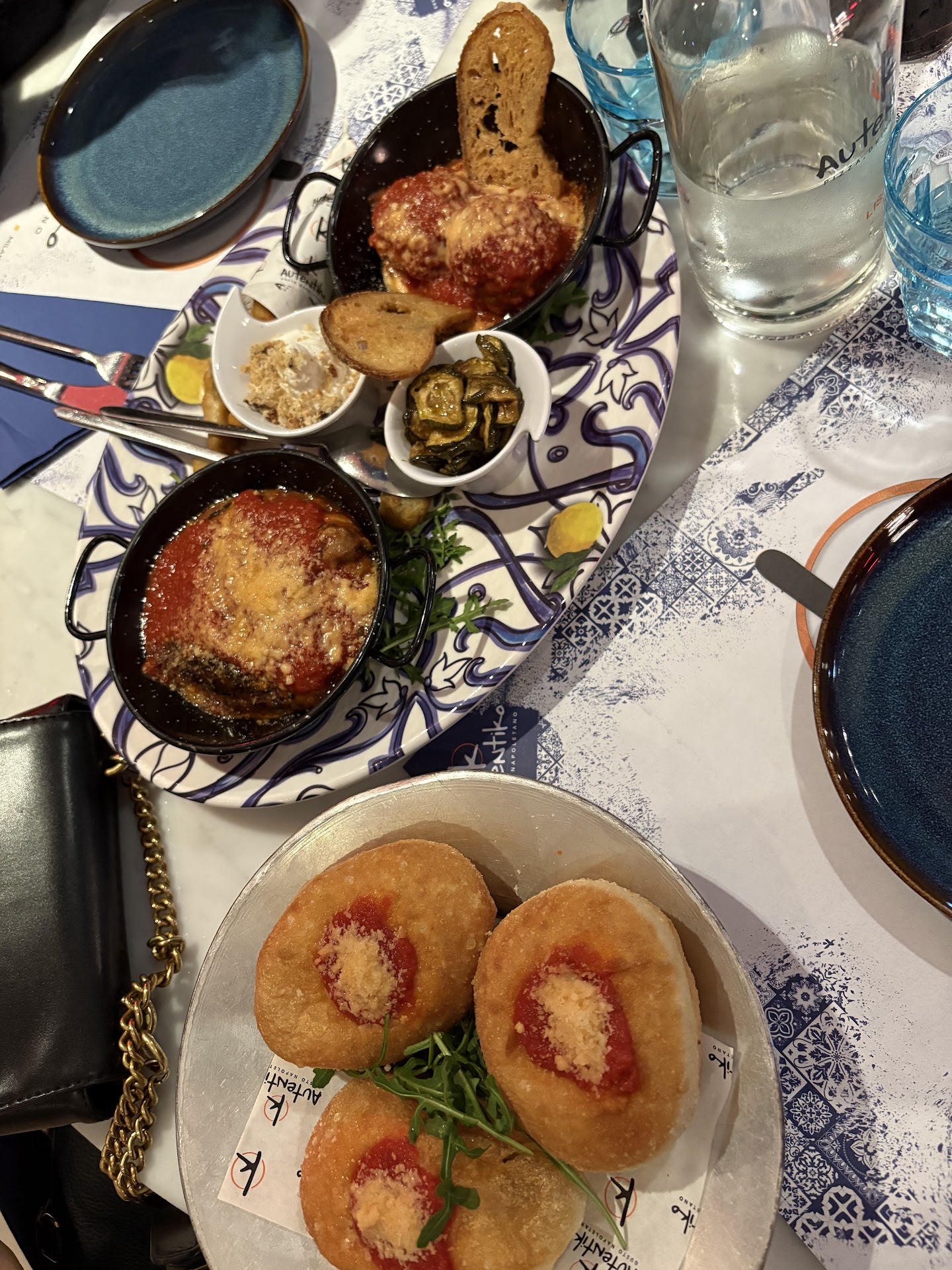Noi optiamo per la pizza: una Napoli (pomodoro San Marzano DOP, fior di latte di Agerola, acciughe del Cantabrico, origano e basilico) e una Maradona (pomodoro San Marzano DOP, fior di latte di Agerola, polpette di carne fatte in casa, ricotta di fuscella e basilico). Dopo una decina di minuti, vista la pizzeria molto piena, ci viene offerto un piattino di impasto fritto – gesto semplice ma non scontato – per scusarsi della lieve attesa, che in realtà è stata di soli 20 minuti.