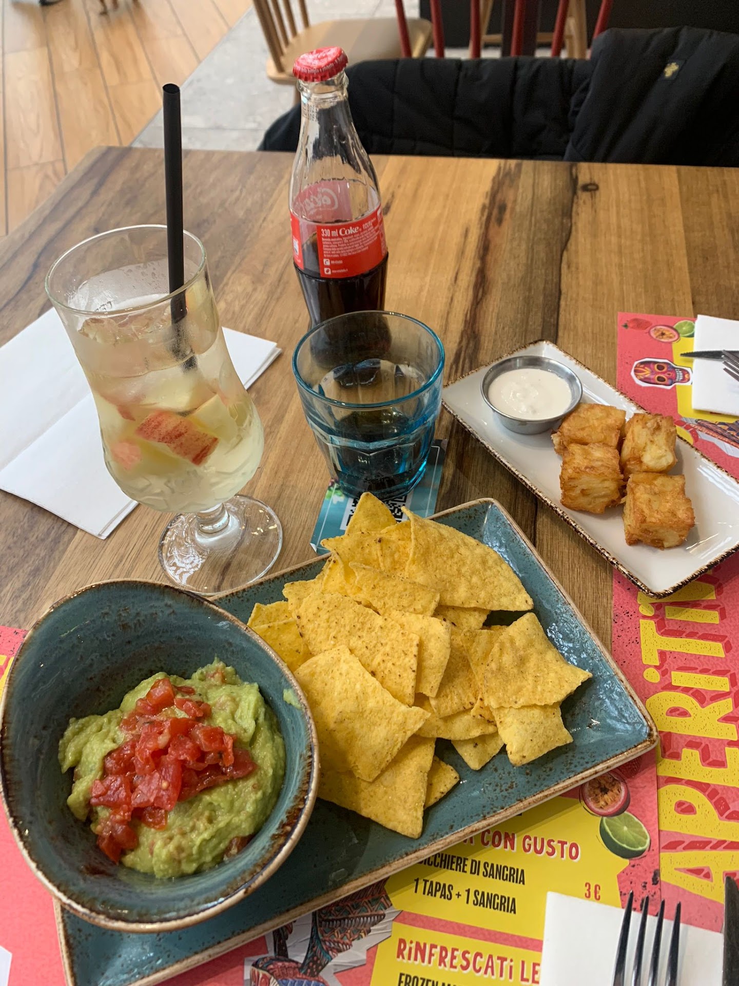 Read moreMi reco da Calavera per la prima volta insieme alla mia ragazza, per pranzare all'interno del parco commerciale "Il Centro". Premetto che, avevo sentito della catena ma non avevo mai avuto la possibilità di mangiarci, così colgo l'occasione. Preciso che la mia ragazza era molto scettica in quanto lei non mangia piccante, ma tentare non nuoce. Fortunatamente, grazie alla varietà del menù, ed ai consigli del personale riusciamo a prendere qualcosa di non piccante anche per soddisfare entrambi. Cibo buono, consigliatissimi i TACOS, con il "menù" da 4 tacos si possono scegliere fino a due varianti di condimento, io ho scelto salsiccia messicana e sweet chili, e pollo in agrodolce alla messicana(top). Buoni i nachos e le "crocchette di patate". Sangria bianca, sapeva un po' di aceto ma nel contesto è bevibile. Personale molto gentile e disponibile Unica delusione i "churros", presi quelli piccoli, ci vengono portate queste "palline fritte" ripiene di cioccolata, praticamente minuscole (a dire del cameriere, erano più grandi e comunque sia sarebbero dovute essere a forma di ferro di cavallo) Locale niente di che, buono per un pranzo al volo. Prezzo normale, 40 euro circa in due, senza alzarmi troppo sazio. Unica pecca che alcuni prodotti, si possono ordinare solo "take away"...