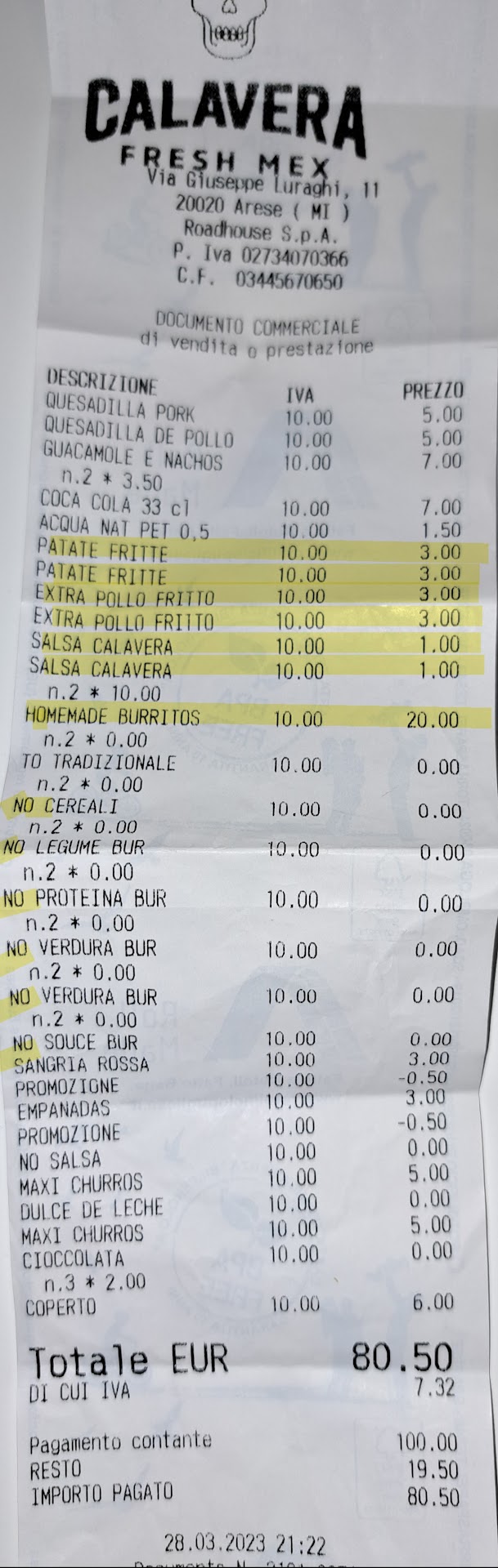 Read moreMI HANNO TRUFFATA! Mi sono recata questa sera per mangiare con i miei figli! Chiedo se fosse possibile avere il burritos simile a quello d'asporto per i miei bambini (con pollo fritto e patatine con aggiunta di 1 salsa, senza formaggio ne altro) in quanto non avrebbero mangiato altro, era già capitato e li avevano "accontentati". Dopo un primo rifiuto e la mia intenzione di andare via perché altrimenti non avrebbero mangiato nulla altre volte mi confermano che si poteva fare! Mangiamo il cibo buono come al solito poi alla cassa mi presentano un conto stranamente salato (80€) e da una verifica mi accorgo che mi hanno fatto pagare il burritos VUOTO come da menù .... 10euro l'uno aggiungendo gli unici 3 ingredienti inseriti come fossero extra! Quindi per un burritos che da asporto si paga 7euro ho speso la cifra assurda di DICIASSETTE ..... 17euro....... Pensando ad un errore sono tornata convinta in un rimborso, non pretendevo di pagarlo come da asporto, mi sarei accontenta di uno sconto anche minimo ..... ma invece mi è stato detto che era tutto regolare e che non potevano fare nulla! MI SENTO TRUFFATA Come minimo al momento dell'ordine quando mi hanno confermato la fattibilità avrebbero dovuto avvertirmi del prezzo assurdo che avrei pagato! DO UNA STELLA perchè non posso non metterne 0 ma quello che si meritano è qualcosa che una signora non dovrebbe né dire né...