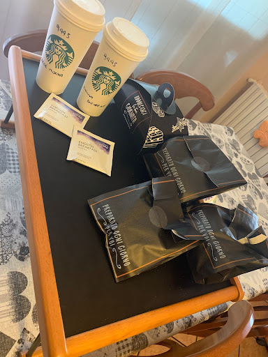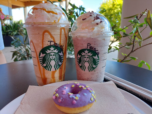 Read moreC'è poco da dire, se conoscete Starbucks non rimarrete delusi, il menù è ben assortito, spazia dal normale espresso, ai frappuccini senza caffè, ed ai vari tea. Ho letto molti lamentarsi del costo, presumo dei frappuccini, vari shake etc.. che però a mio avviso sono ben al di sotto del costo di un prodotto al pari di quello che scegli, ad esempio un milkshake o frappè lo paghi generalmente intorno ai 4-5€ in gelateria, contando che qui non hai solo gelato e latte, ma anche panna, sciroppi, cioccolato o altri, in base a cosa decidi.. Il costo è decisamente nella norma. Un caffè espresso è pari a quello del bar come costo infatti. Per chi non fosse abbastanza sgamato (o sveglio) consiglio di utilizzare il QR code presente sui diversi tavolini e sul bancone per poter consultare il menù completo, perché dietro al bancone spesso vengono riportate solo poche bevande e per lo più vengono pubblicizzate le novità... insomma, se non siete avvezzi alla tecnologia aprite un attimo gli occhi e non lamentatevi (inutilmente ed a posteriori, dato che basterebbe chiedere anche alle commesse, gentilissime, per avere indicazioni sulle bevande) se non siete in grado di arrivare ad usare una tecnologia esistente ed in uso da anni.. Personalmente adoro il frdappuccino al caramello (quello a sinistra nella foto) con aggiunta di cioccolato bianco e ovviamente mantenendo la panna. Sono disponibili una quindicina di tavolini tra interno ed esterno, ed il locale è situato all'interno del Mondadori Store che rende la pausa ancora più speciale. Se amate Starbucks e siete già nel centro commerciale, una visita è d'obbligo!...