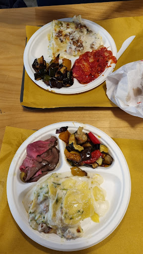 Le porzioni sono abbondanti per il costo, non hanno tantissimi piatti tra cui scegliere ma la varietà è molto buona. Io ho preso per esempio lasagne zucchine e salmone, roastbeef e verdure miste. Ma c'era tra le scelte anche pasta al ragu, tortini di patate, purè, fagiolini e carote, patate al forno, baccala e forse anche altro che non ricordo. Compreso nel prezzo anche un sacchettino con pane e focaccia.
