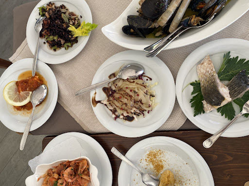 Read moreSi percepisce che è un ristorante travestito da chiosco. Ma è pur sempre un chiosco. Comunque vista la gran scelta e i prezzi del menù mi aspetto quasi il top per ogni settore. Invece… 5 stelle per il servizio impeccabile, 4 per una location troppo da chiosco, e 4 stelle perché ahimè, non si trovano seppie e calamari freschi ma solo surgelati e questo non è accettabile, sia perché siamo a due passi dal porticciolo, sia perché con quei prezzi e con l’ambizione di essere un ristorante di alto livello, non puoi non avere seppie e calamari freschi. Ultima nota dolente appunto i prezzi, avrei messo 3 stelle, secondo me troppo elevati considerando quanto sopra esposto. 40 euro per un assaggio di 6 antipasti è tanto (tutti ottimi, ma cozze tropo piccole). 4 ostriche minuscole a 14 euro. Poi abbiamo optato per il “meno caro” 18 euro per il polpo fritto, perché non c’erano ne calamari ne seppie fresche e il pescato era a oltre 6 euro l’etto. Ci hanno proposto un rombo da 1 kg (65 euro) e una spigola da 700 grammi (45 euro). Anche il polpo ugualmente stride, anche se era ottimo ma forse si paga la tanta scenografia. Comunque conto finale circa 130 euro in due aggiungendo due bottiglie da 33,5 di costa molino acqua e 1 sorbetto. 65 euro a testa, tirate voi le somme. A me sembra un po’ tanto, comunque la qualità...