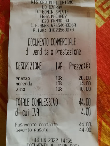 Read moreSiamo stati oggi allo Dzerby . Bel locale tipicamente montano . Noi siamo stati collocati all'aperto sotto i castagneti . Una FAVOLA . Il menù classico valdostano salumi , castagne e burro , patate salignun( ricotta con spezie varie ) cotechino e un'ottima polenta concia e normale con formaggi locali. Dolce di castagne grappa e grappa e miele La polenta mi hà riportato alle mie origini. Nato in valle ma trasferitomi da piccolo in Piemonte ( pv . CN ) .La polenta integrale presentava un .leggero retrogusto di bruciato ( nel senso buono ) dovuto alla parte di polenta che a contatto del paiolo in cottura tende a bruciacchiare. Il prezzo ONESTISSIMO per tutto il mangiato e bevuto . Abbiamo saltato la seupa valtellinese in quanto il nostro sacco non avrebbe retto . Dai BRAVI complimenti avanti così. Sicuramente...